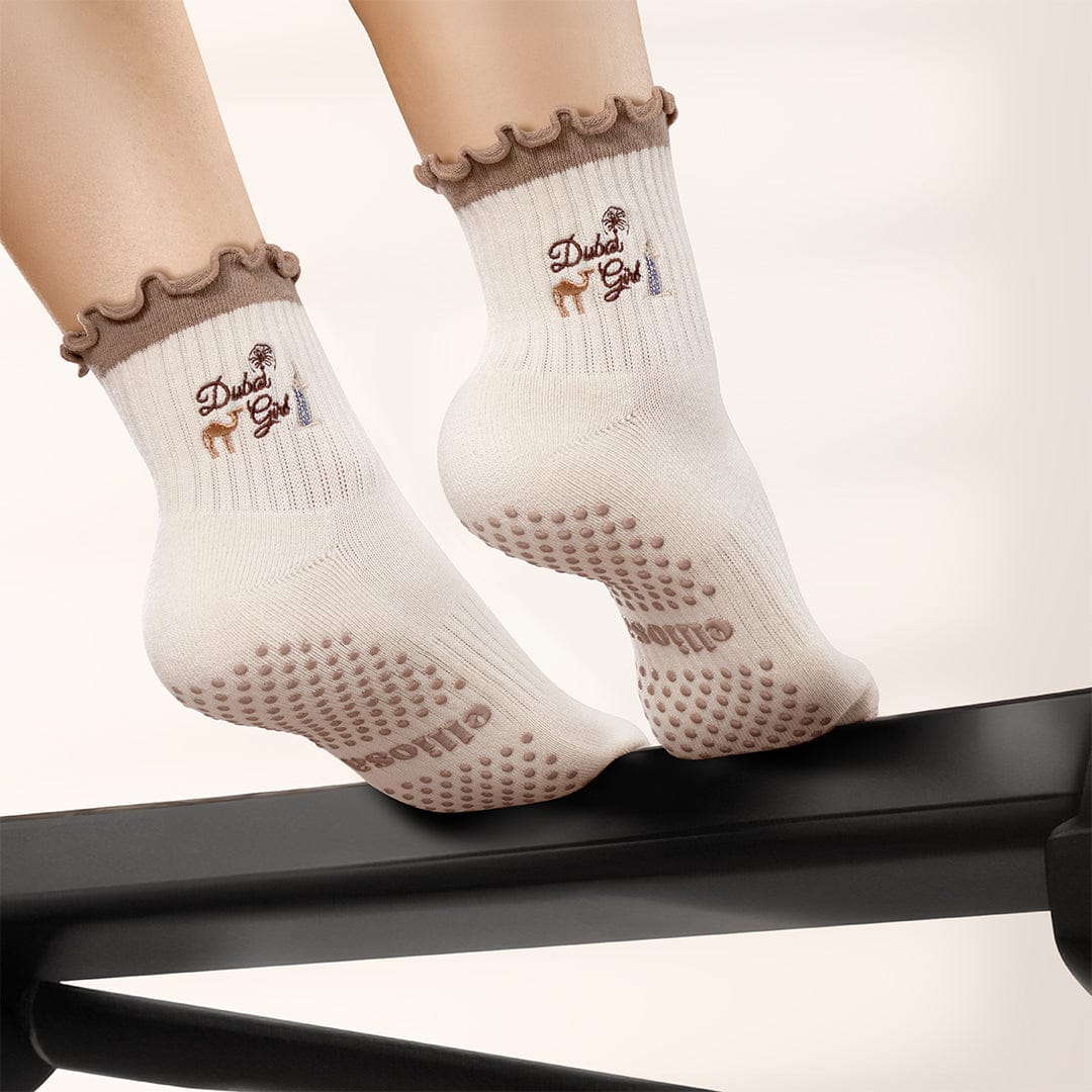 Made with our signature cushioned sole and secure grip support, these socks keep you steady through every Pilates flow while adding that luxe Dubai feel to your routine.